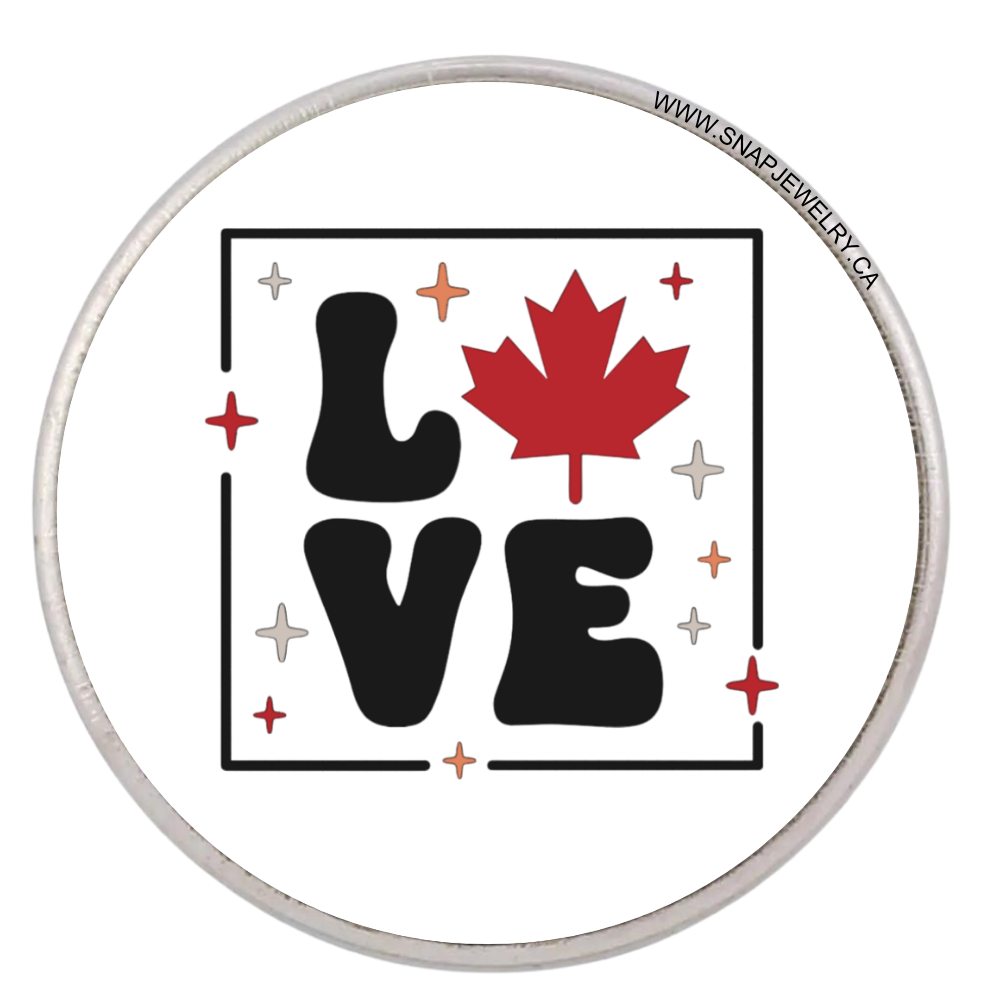 Show your Canadian love in bold style! This modern snap features the word โLOVEโ with a maple leaf in place of the โO,โ surrounded by playful stars. A great pick for patriotic outfits or as a gift that says it all.