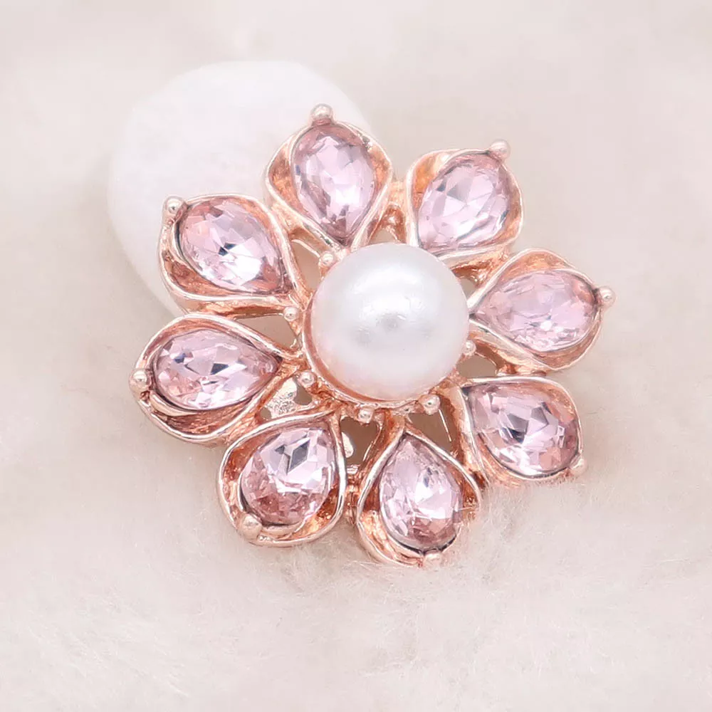 Add a touch of floral elegance with this rose gold snap featuring teardrop-shaped pink crystals and a luminous pearl center. A sparkling statement piece that pairs beautifully with any pendant or bracelet.