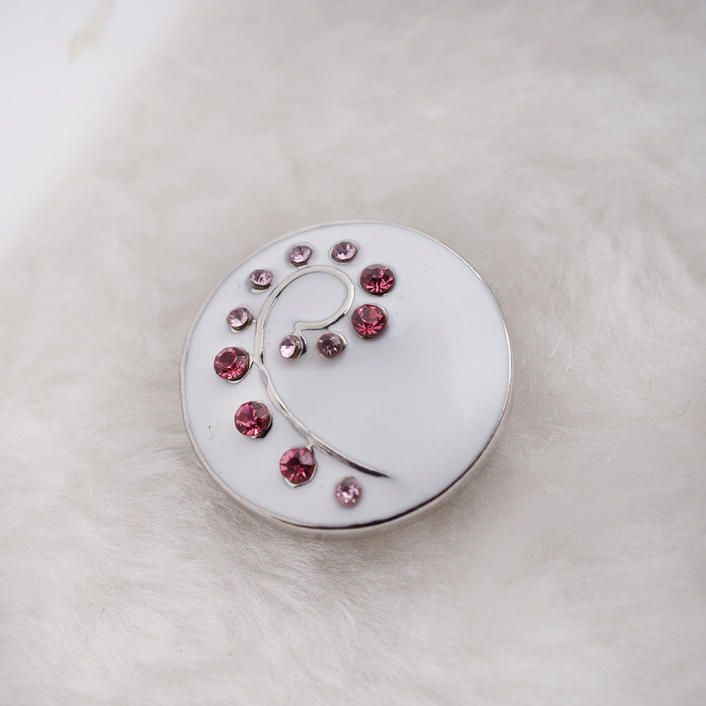 A sleek white enamel snap accented with a graceful silver swirl and pink rhinestones โ a modern, minimalist design with a touch of sparkle and feminine charm.