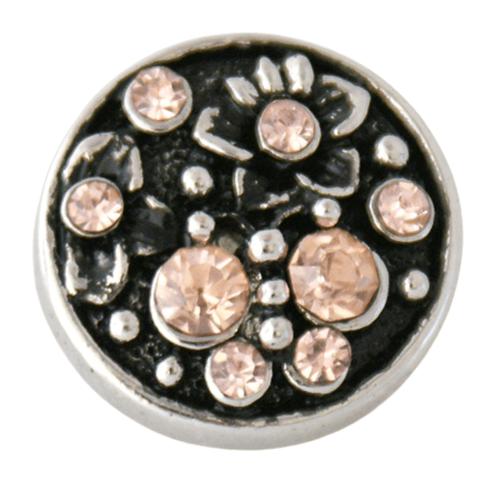 Black snap featuring a butterfly and flower design accented with soft orange crystal gems. A subtle sparkle that adds charm and elegance to any snap accessory.