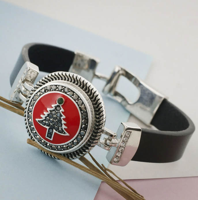Classic red and silver snap featuring a sparkling black crystal Christmas tree with a green accent topper โ perfect for festive style.