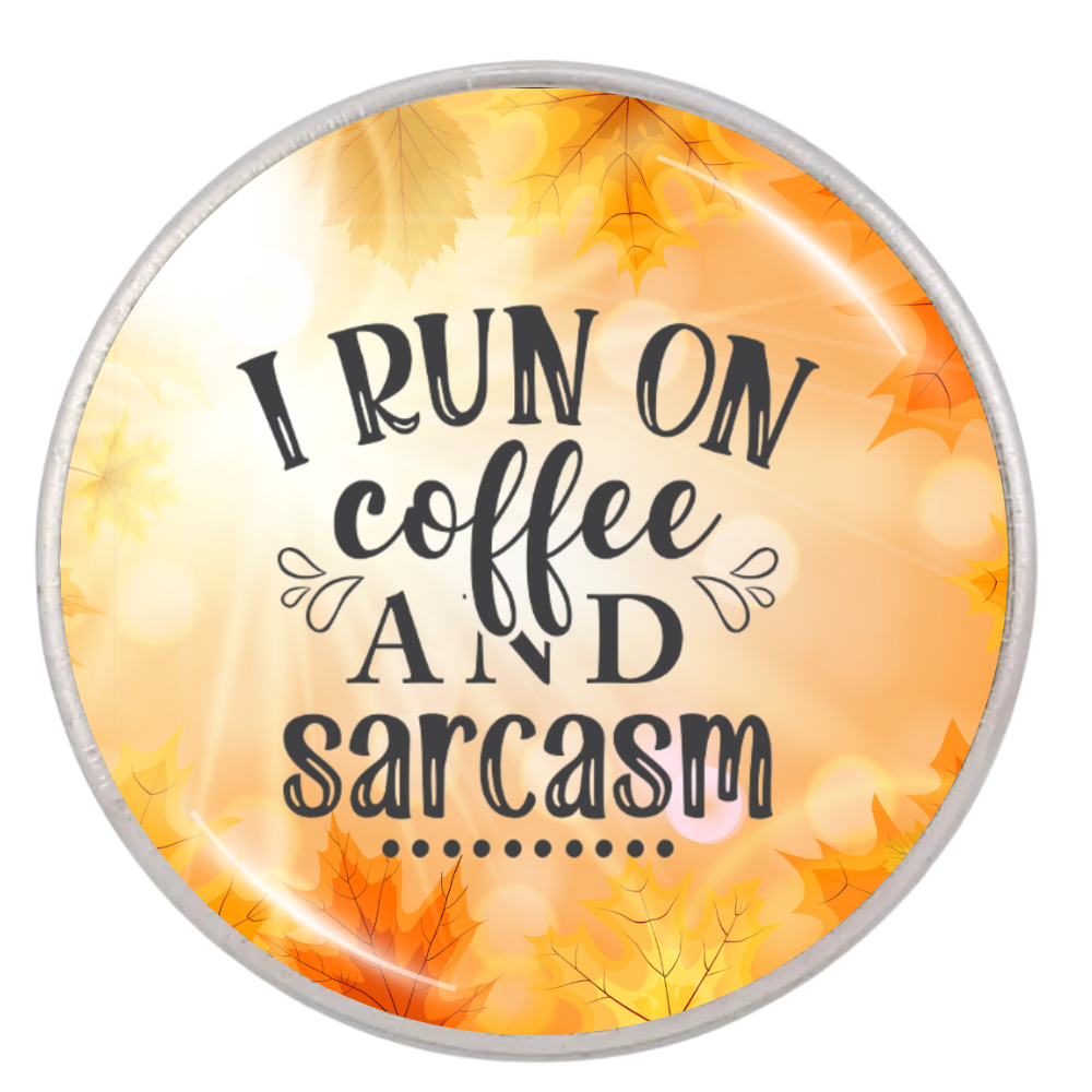 Featuring the witty phrase โI run on coffee and sarcasmโ with a warm autumn leaf background. A fun seasonal snap for coffee lovers with attitude.