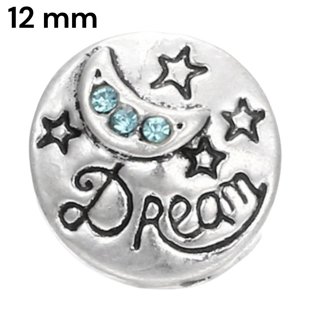 Embrace celestial vibes with this dreamy snap featuring a crescent moon, sparkling blue rhinestones, and whimsical stars. The engraved “Dream” reminds you to stay inspired.