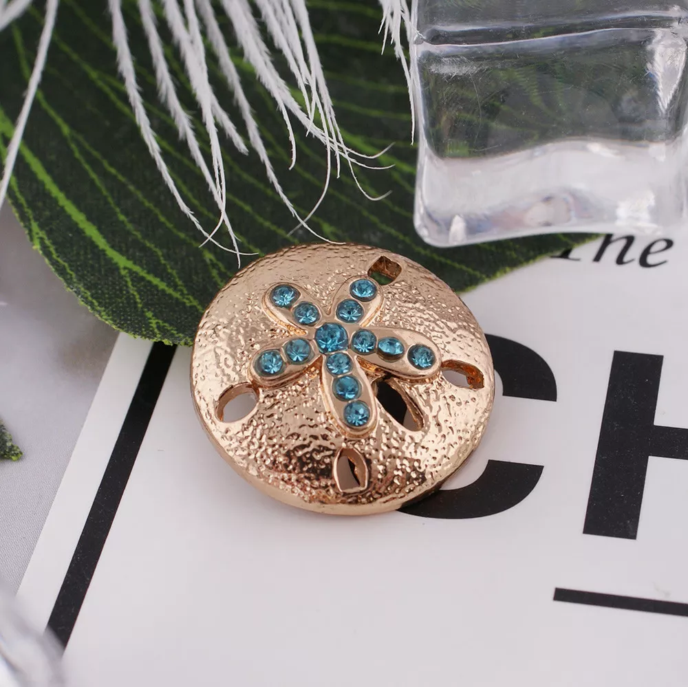 A shimmering gold sand dollar adorned with sparkling aqua crystals โ this coastal-inspired snap brings a touch of seaside beauty and beachy elegance to your style.