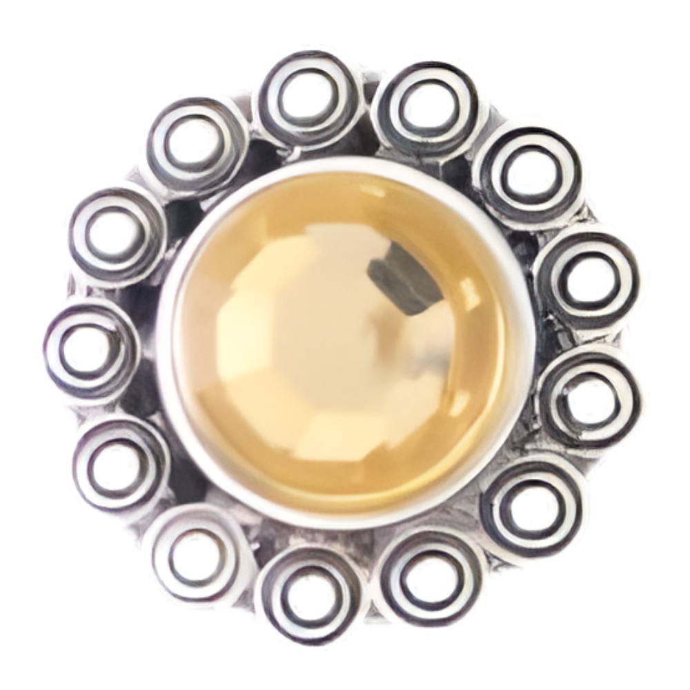 A bright golden crystal sits at the center of this detailed ring-style snap, framed by a pattern of raised circular accents. Warm, classic, and perfect for adding a subtle touch of shine to any snap accessory.