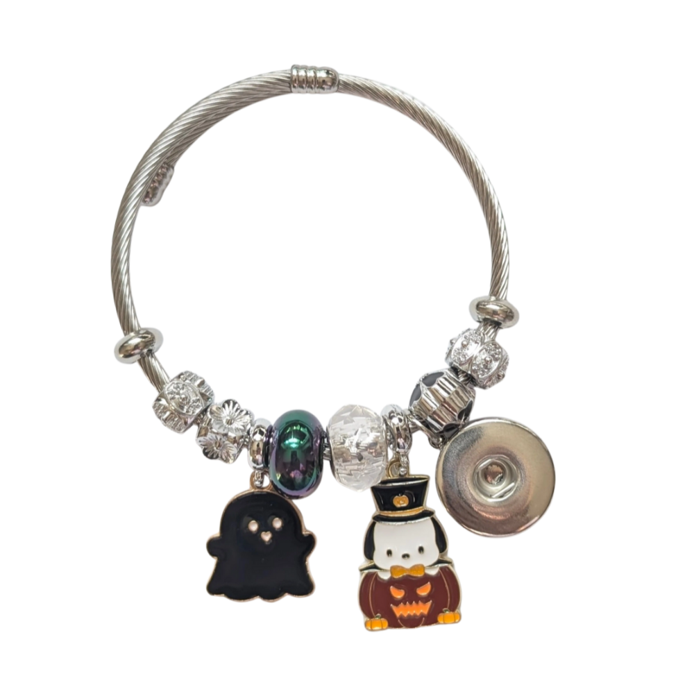 Spook up your style with this Halloween charm bangle! Featuring playful charms and a snap base for your favorite interchangeable snaps, itโs the perfect mix of fun and fashion for the spooky season.