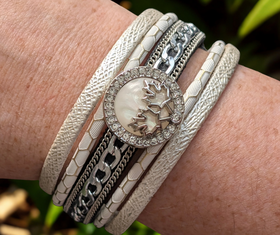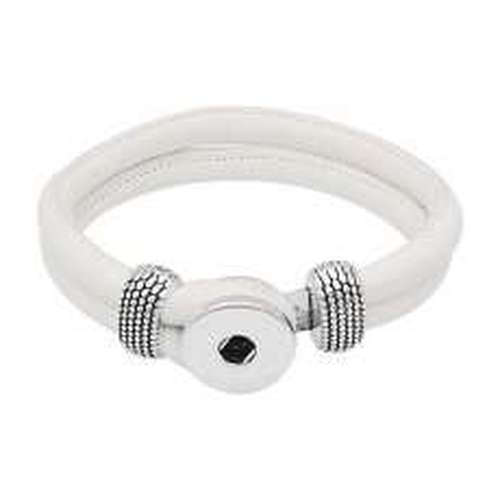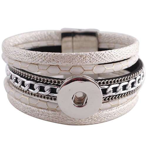 Bold and stylish, this white multi-layer snap bracelet features textured bands, metallic chain accents, and a secure magnetic clasp. Includes a snap base for easy personalization with interchangeable charms.