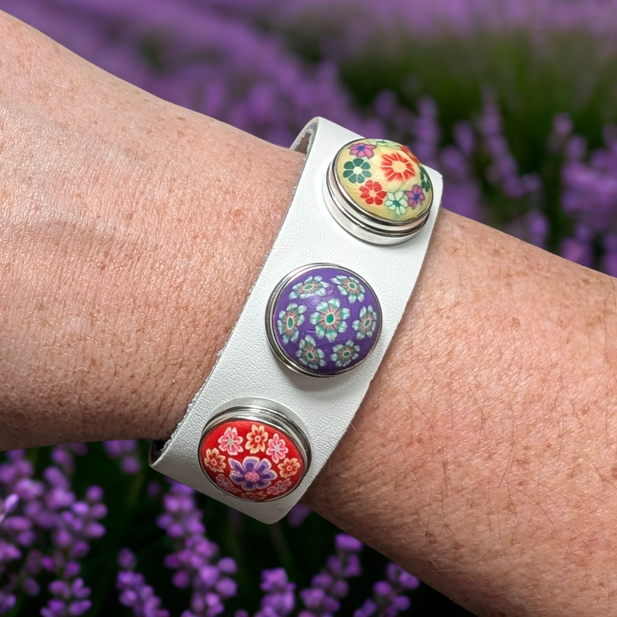 A sleek and versatile beige faux leather bracelet with stitched edging and a magnetic claspโelegant enough for everyday wear, unique enough to personalize with your favorite snap.