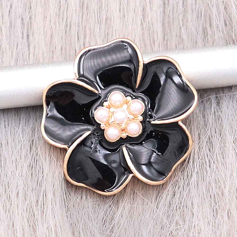 This elegant snap features glossy black petals with a cluster of luminous pearls and a sparkling crystal at the center. A timeless design that blends sophistication and bold style effortlessly.
