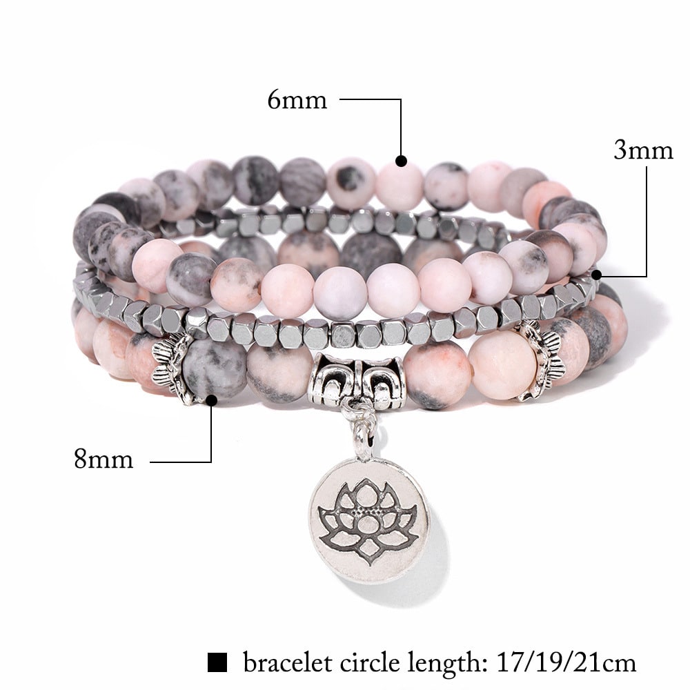 This elegant, three-layer stretch bracelet features genuine pink and grey jasper-style beads accented with metallic spacers and a polished silver snap base. It’s a beautifully textured piece designed for easy, all-day wear with your favorite snap charms.