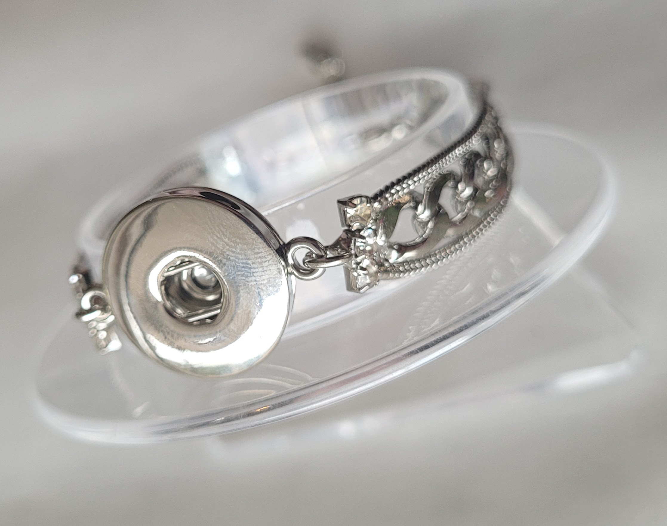 Elegant and eye-catching, this silver bracelet features a linked chain design accented with rhinestones. Compatible with standard snaps, it’s perfect for adding a touch of sparkle to your personalized style.