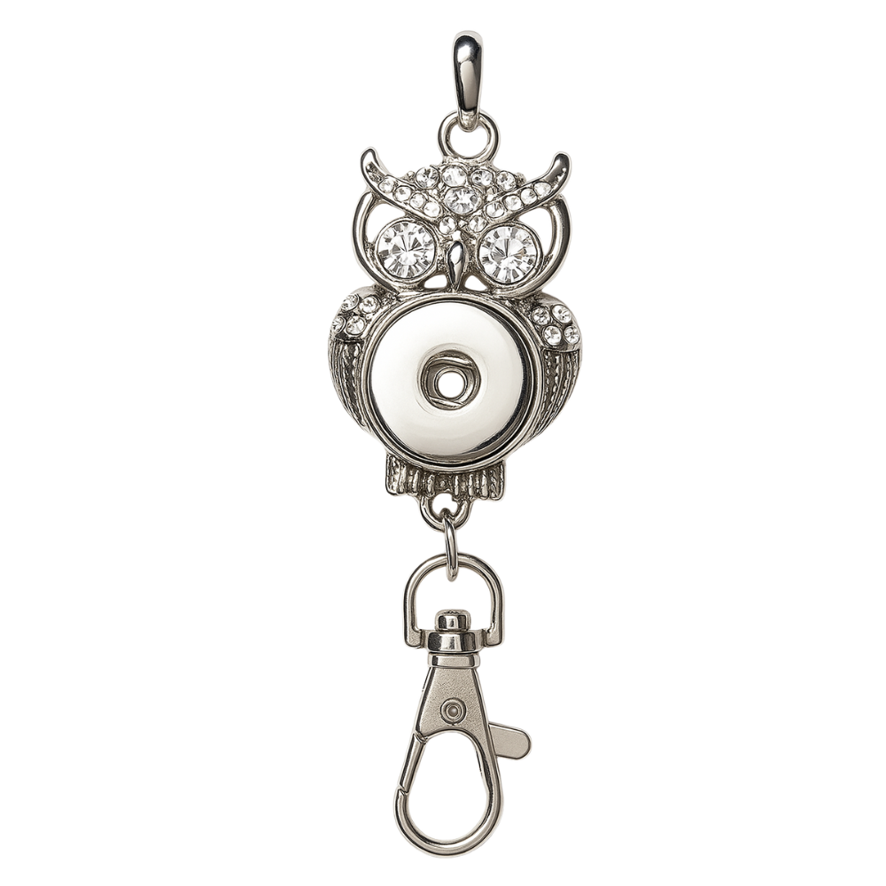 A charming owl badge clip featuring sparkling clear crystal eyes and a built-in snap base. A fun and whimsical way to personalize your work ID, name badge, or lanyard. Includes 80 cm chain.