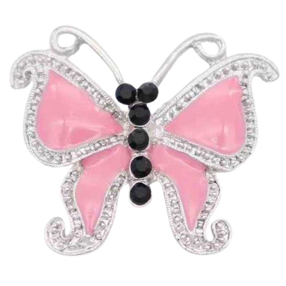A delicate butterfly snap adorned with pink and turquoise crystals and a luminous pearl center โ a graceful symbol of transformation and beauty, perfect for adding a soft sparkle to your jewelry. Measures 25mm across (fits all regular snap bases).
