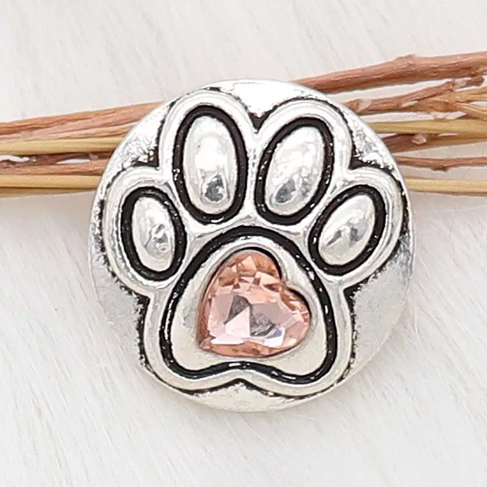 Show your love for furry friends with this adorable snap featuring a silver paw print and a sparkling heart-shaped crystal at its center. A perfect way to add a touch of warmth and charm to your snap jewelry collection.