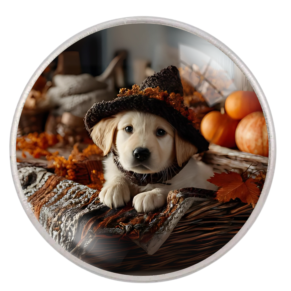 An adorable ginger kitten sitting in a wicker basket filled with autumn leaves, surrounded by a golden fall backdrop. The perfect blend of cozy and cute.