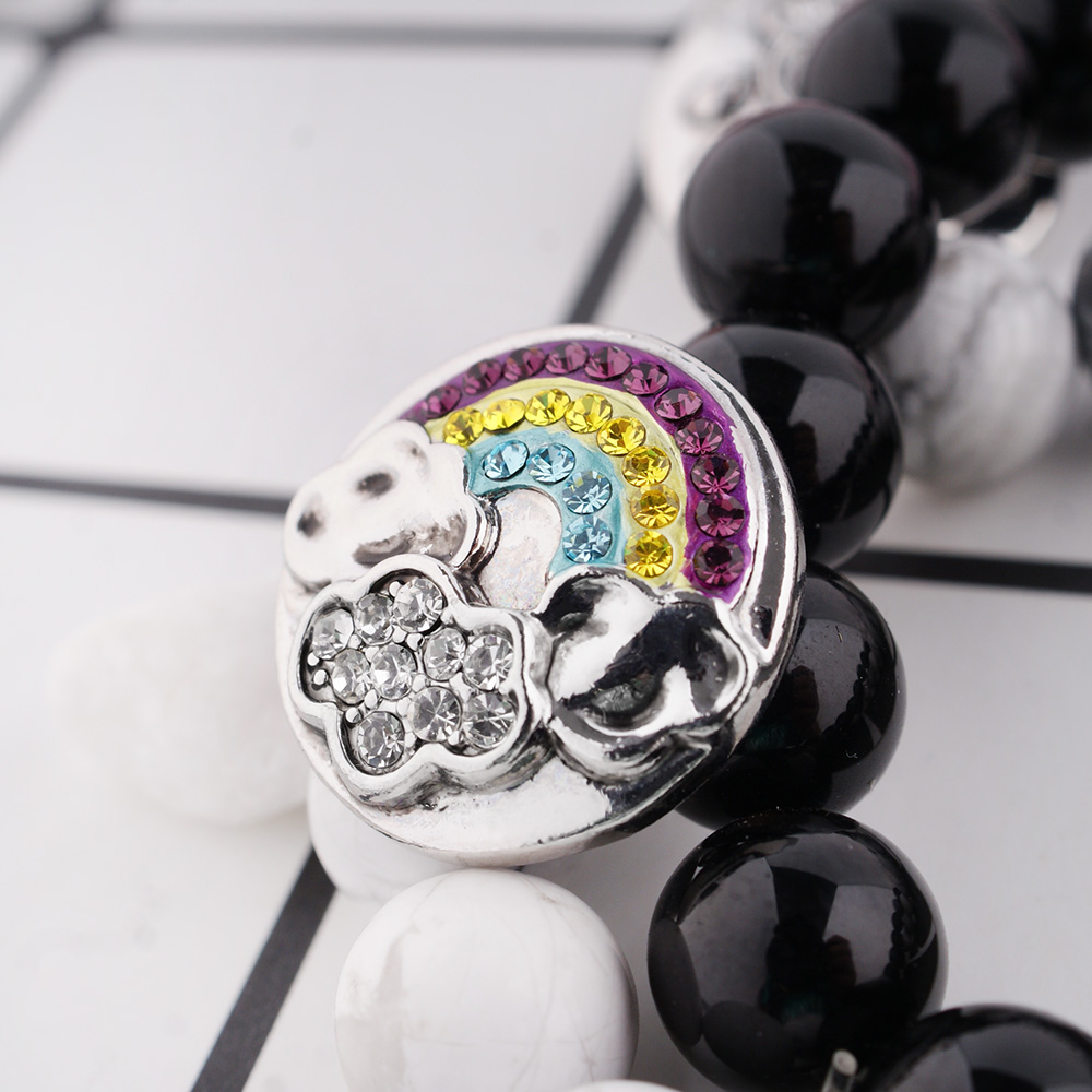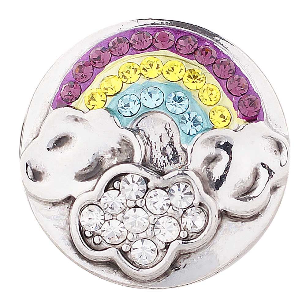 A cheerful snap featuring a sparkling rainbow arched above silver clouds accented with clear rhinestones โ a playful and uplifting design that adds a pop of color and joy to any snap jewelry piece.