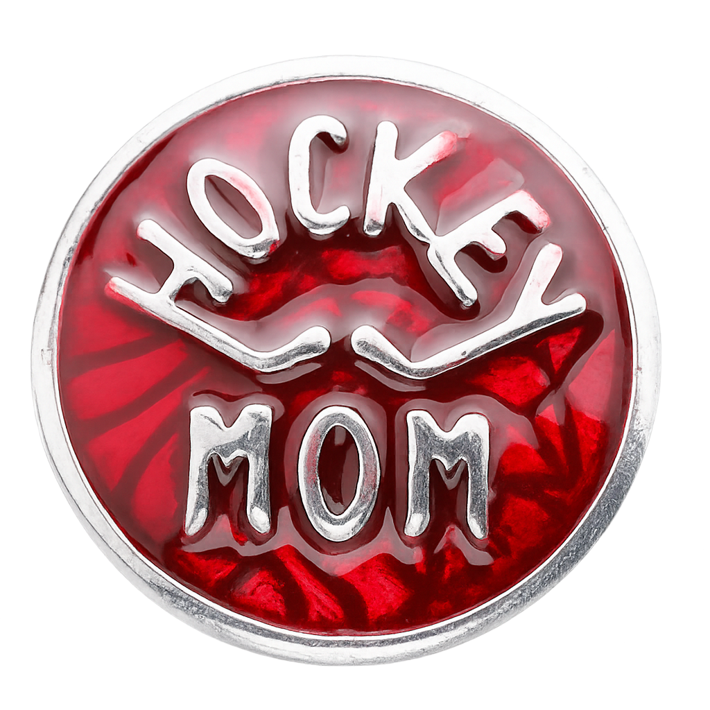 A striking red enamel snap with bold silver lettering โ the perfect way for hockey moms to show their pride.