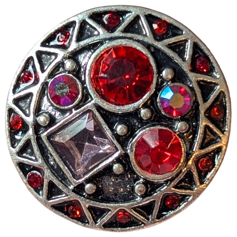 A striking snap featuring a mix of red and pink gemstones in various shapes set in antique silver โ bold, vibrant, and full of sparkle.