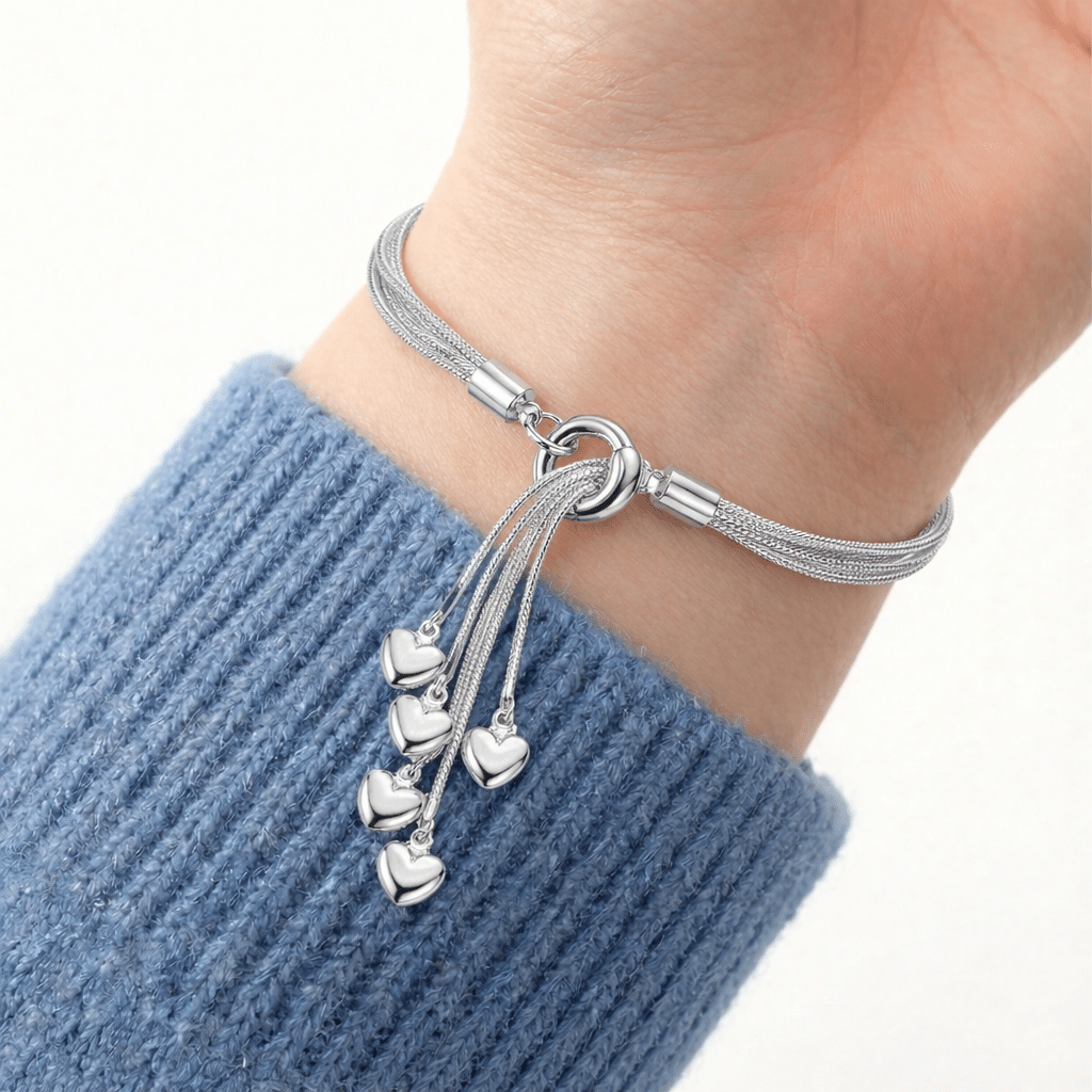 Add a touch of playful elegance to your wrist with this beautiful silver-tone multi-strand bracelet. The design features several delicate, twisted wire strands that come together at a central snap base, ready for your favorite charm. A cluster of five polished silver hearts dangles freely from the closure, adding lovely movement and shine.