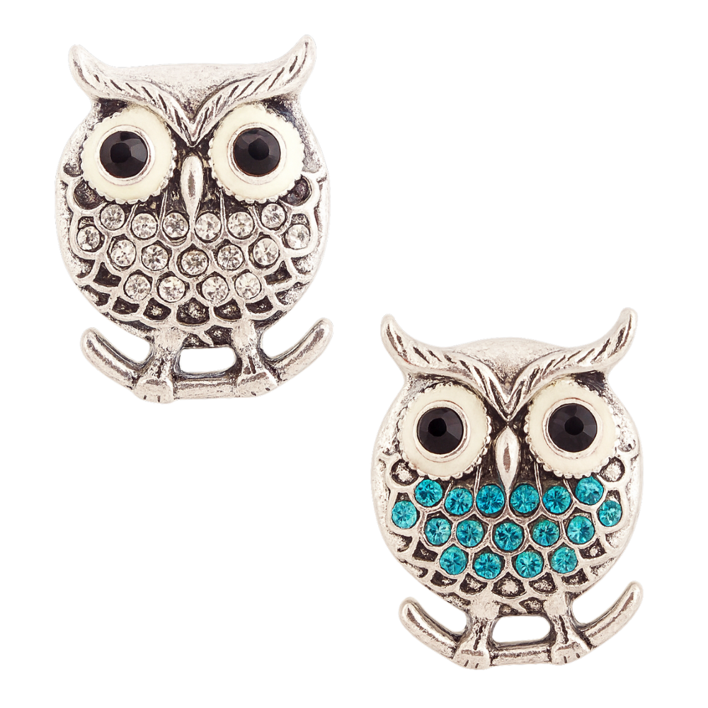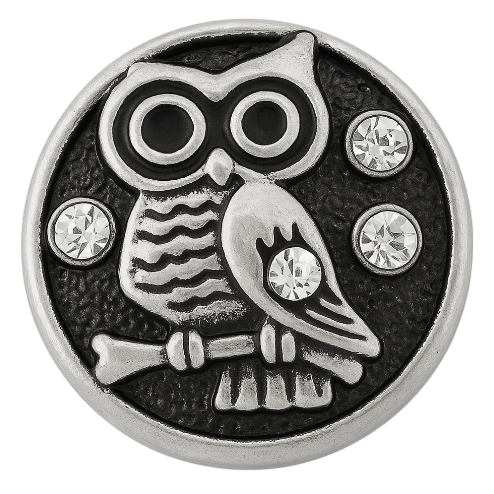 Charming silver-tone snap featuring a crystal-studded owl perched on a branch โ a whimsical touch with a hint of sparkle.