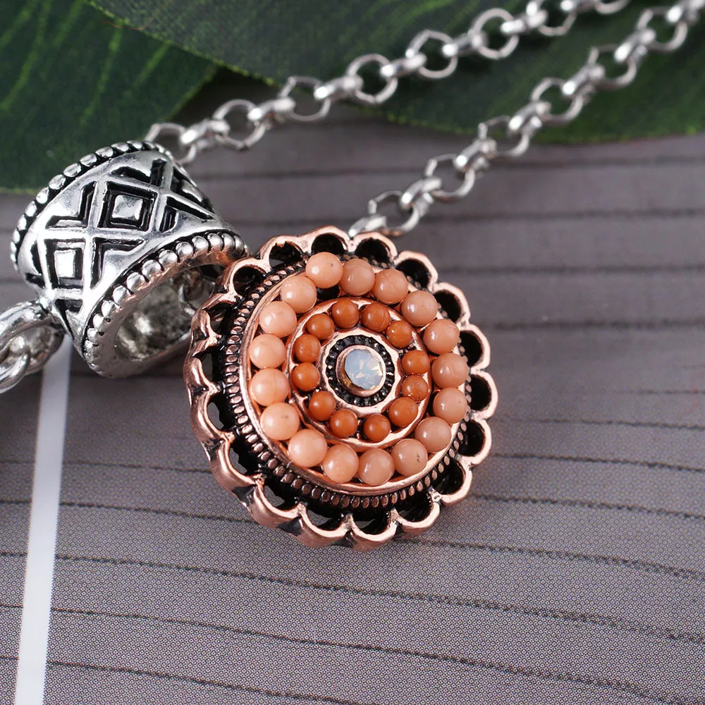 Earthy tones of terracotta and coral beads arranged in a detailed mandala pattern for a warm, boho-chic vibe.