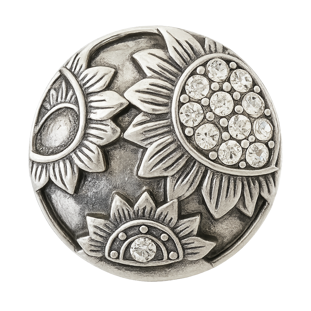 A bright and cheerful snap featuring three detailed sunflower designs, accented with clear crystals โ a perfect touch of sparkle and sunshine.