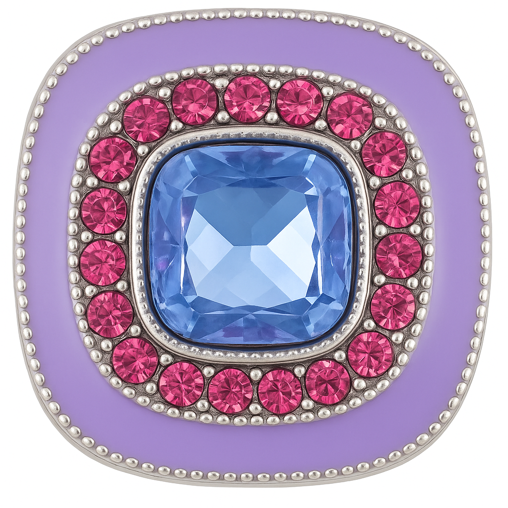 A sparkling blue crystal framed by a ring of rose-pink gems and soft lavender enamel โ this elegant snap radiates modern glam with a touch of vintage charm.