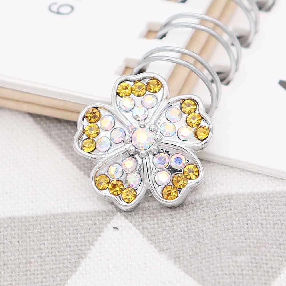 A cheerful silver flower design accented with bright yellow and clear crystals for a fresh, sparkling finish.